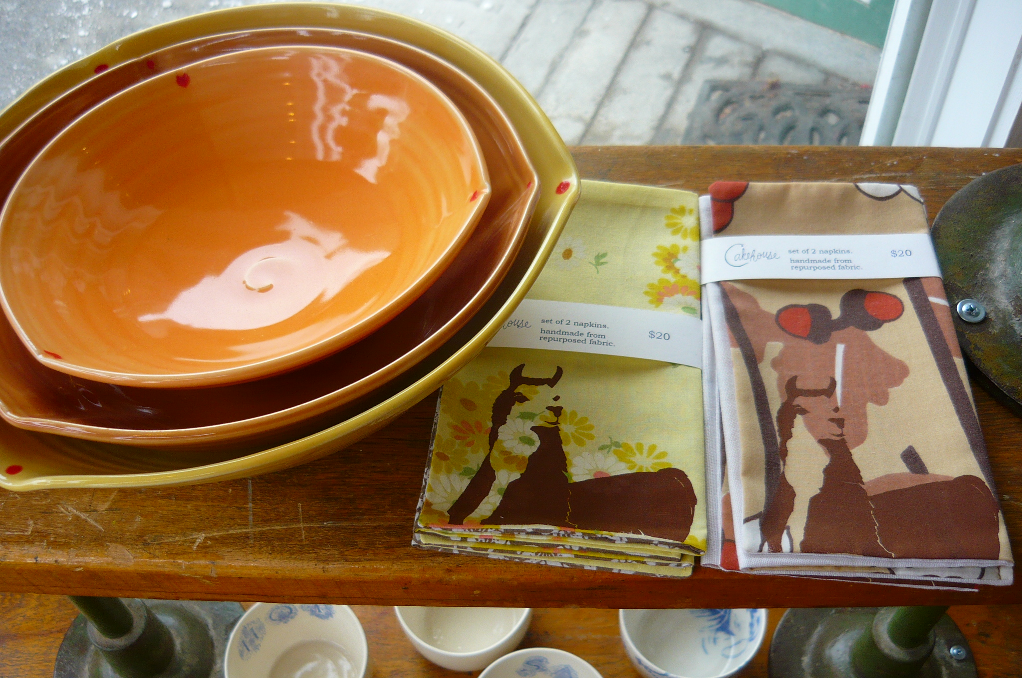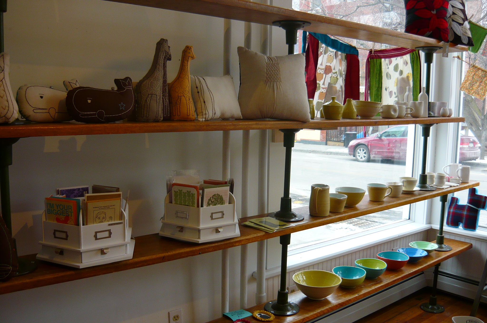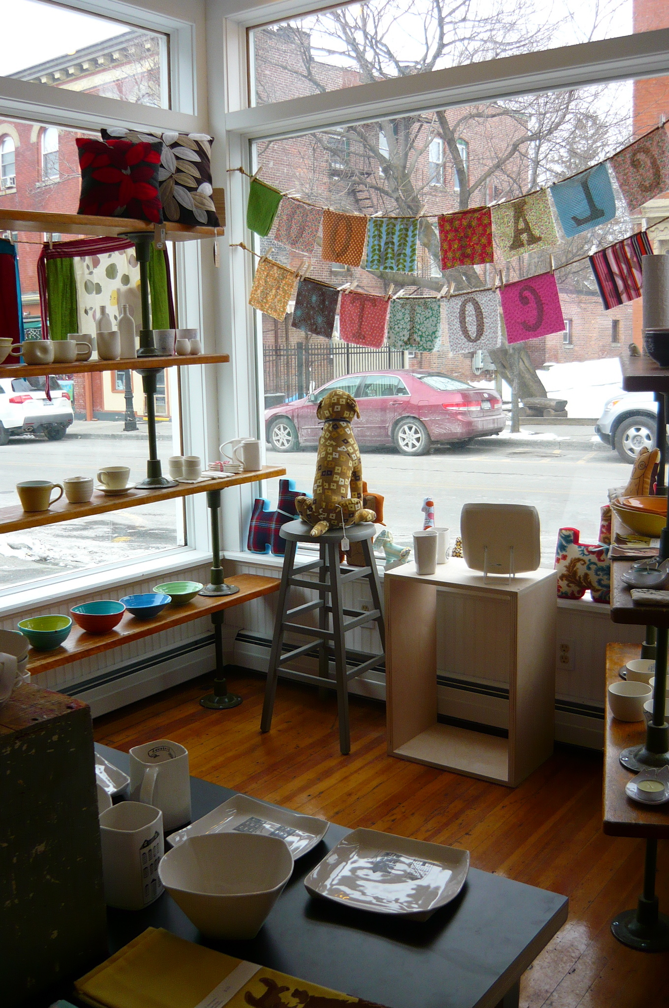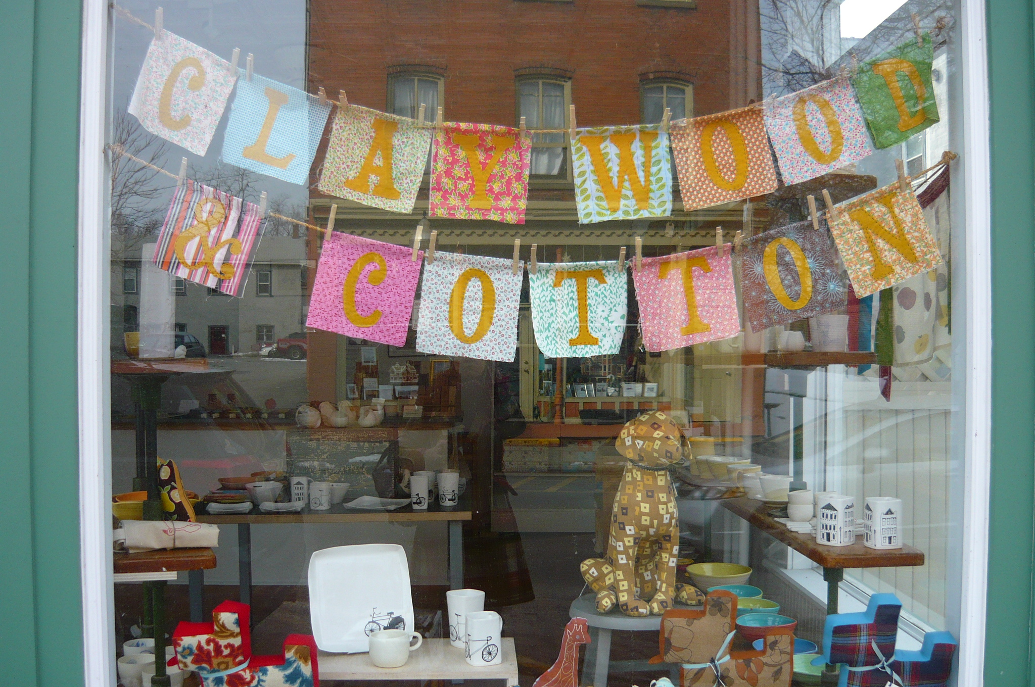 on saturday morning i drove an hour south and taught an embroidery class at clay, wood & cotton in beacon, ny. this was my first visit to the newish shop and it is adorable. it is owned by handmakers kristen (of cakehouse) and kristy (of beacon bookmarks). they carry exquisite hand-crafted home goods, textiles and ceramics, and i coveted nearly everything on the (amazing-and-made-from-old-locker-room-benches) shelves, especially may luk’s ceramics, wonderfluff printed textiles, and those beeswax kitty candles. if you are ever in or near beacon, do check it out, and in the meantime, you can shop online too!