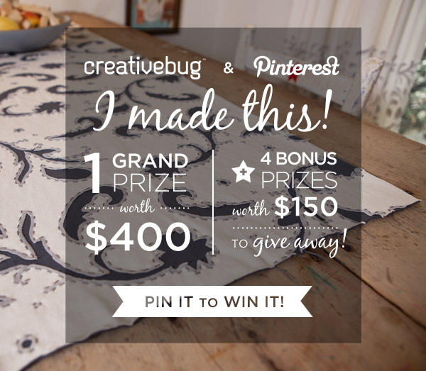 Creativebug is enamored with Pinterest (who isn’t!) so to participate in this contest, you must first be following Creativebug on Pinterest, then create a Pinterest board that includes at least 5 projects you have made, or projects on Creativebug that you would like to take, plus an official contest pin from the Creativebug I made this! Contest Board at