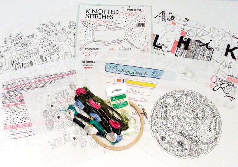 top to bottom: Alabama Studio Sewing & Design + a project kit from Alabama Chanin, yarn by Jill Draper, Rebecca Ringquist’s awesome printed samplers and embroidery kit, and a collection of patterns from Liesl Gibson.