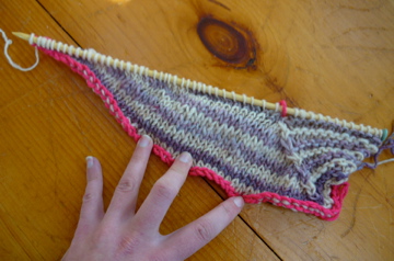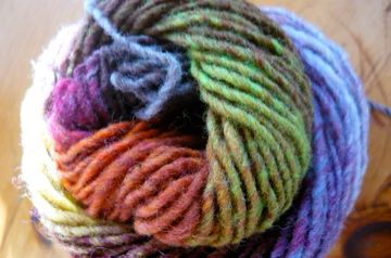i am knitting lee meredith‘s vortex hat, which has been in my ravelry queue for about a year now. there are a lot of ‘firsts’ going on with this project: first time i’ve seen a pattern and bought the exact yarn specified, for the direct purpose of making the project (i know this is how so-called normal people do it, but not usually how i do!). it’s also the first time i am documenting a project in my ravelry ‘notebook’. and it may just be the first thing i have actually knit from a knitty pattern (my newest crush is this sweater…)! i’ve been a bad raveler since day one, even though i think it’s immensely brilliant. anyway, this hat caught my eye because i actually don’t have a perfect go-to hat that i wear all the time, even though i make about a hundred crochet hats every year (probably not a hundred, but a LOT). i like the unusual way it’s constructed, and i like that it’s made from striping together two colors of Noro Kureyon, one of my favorite yarns. so, i have finished the first ‘wedge’, and the pattern is really fun to knit. and lest you think i am making a purple-and-ivory striped hat, i have all of these other colors to look forward to in the above skein! the alternating stripe yarn is a more subtle range of ivories and beiges.