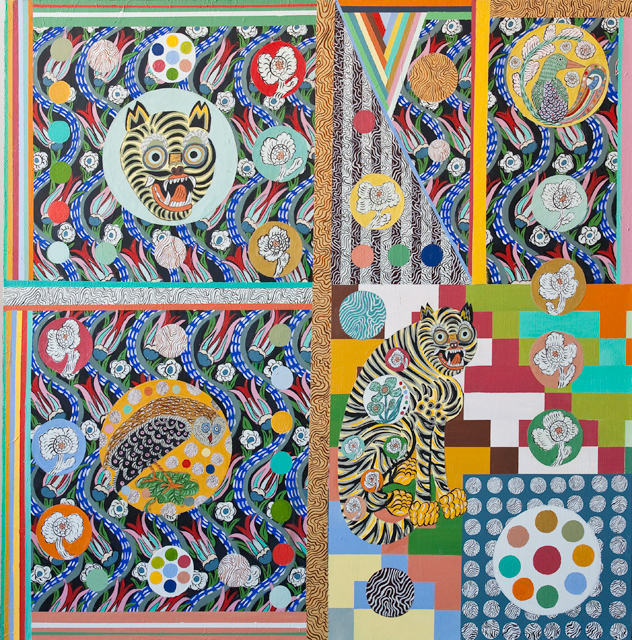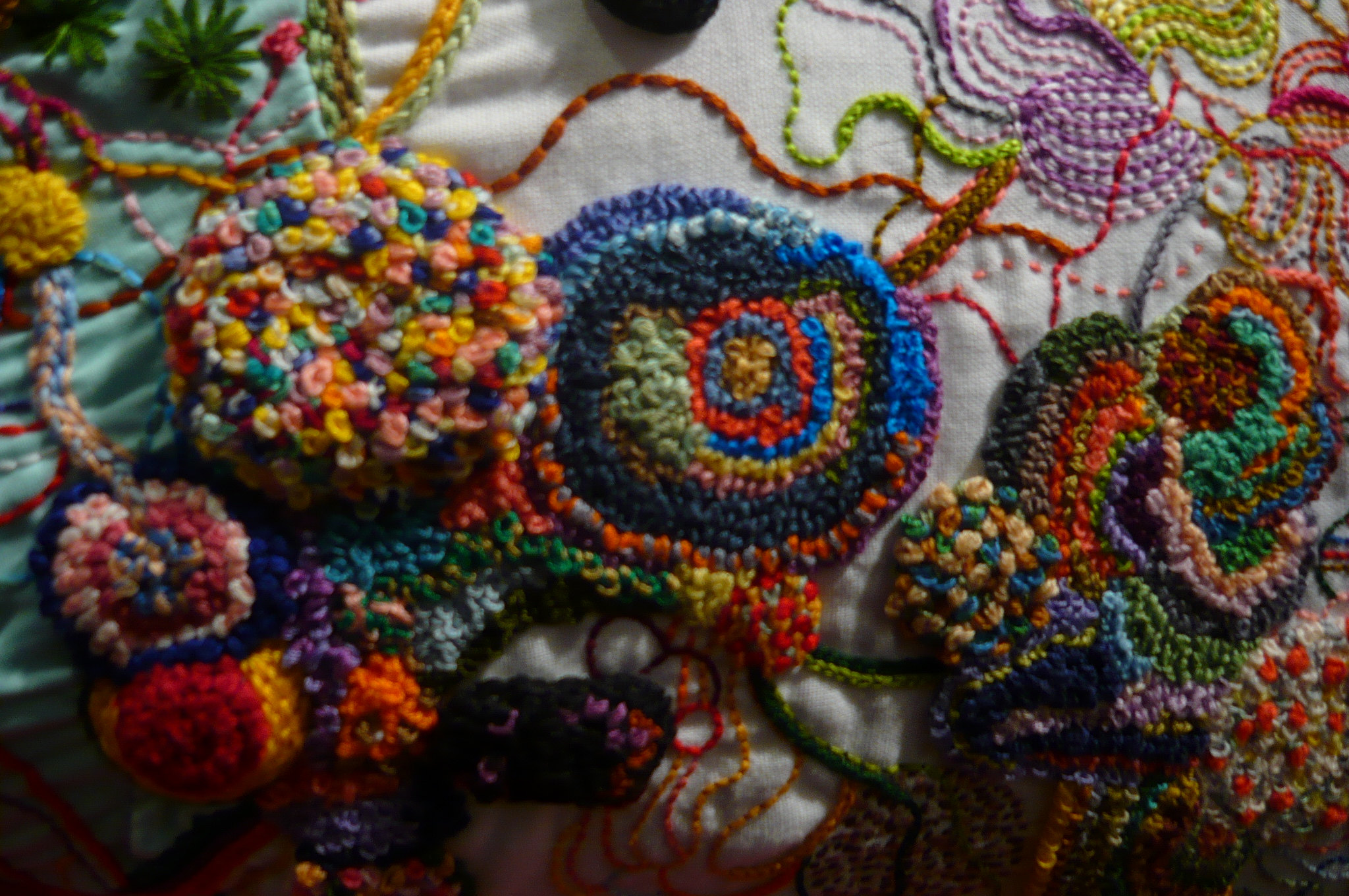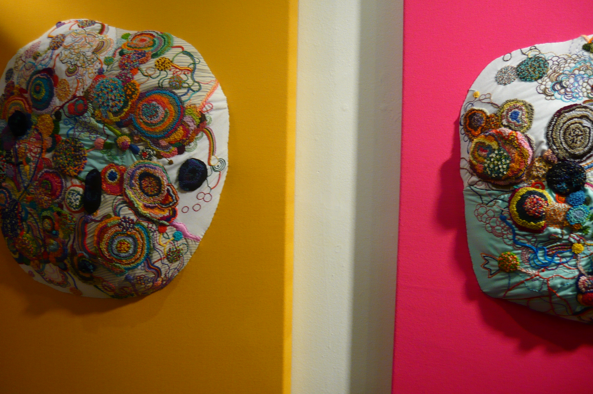 last weekend when i was in the city for my monthly teaching gigs, i got lucky with my timing and was able to catch the opening of love-lies-green, curated by my friend hanna. she used to have a super-cool and crafty gallery in the east village called little cakes, (here are some pics from a 2006 show that i loved) and now she lives about an hour away from me upstate. the show was at mountain fold gallery and featured two artists: cristina toro and rebeca raney. i love cristina’s paintings (that’s the beautiful artist, who also lives in upstate NY, above left with darling erika somogyi) which remind me of textile prints and animal-filled story books. her use of color is inspirational. and rebeca’s intricate and dense embroideries are pretty spectacular, both technically and aesthetically! the show is up through february 20th so stop in if you can…