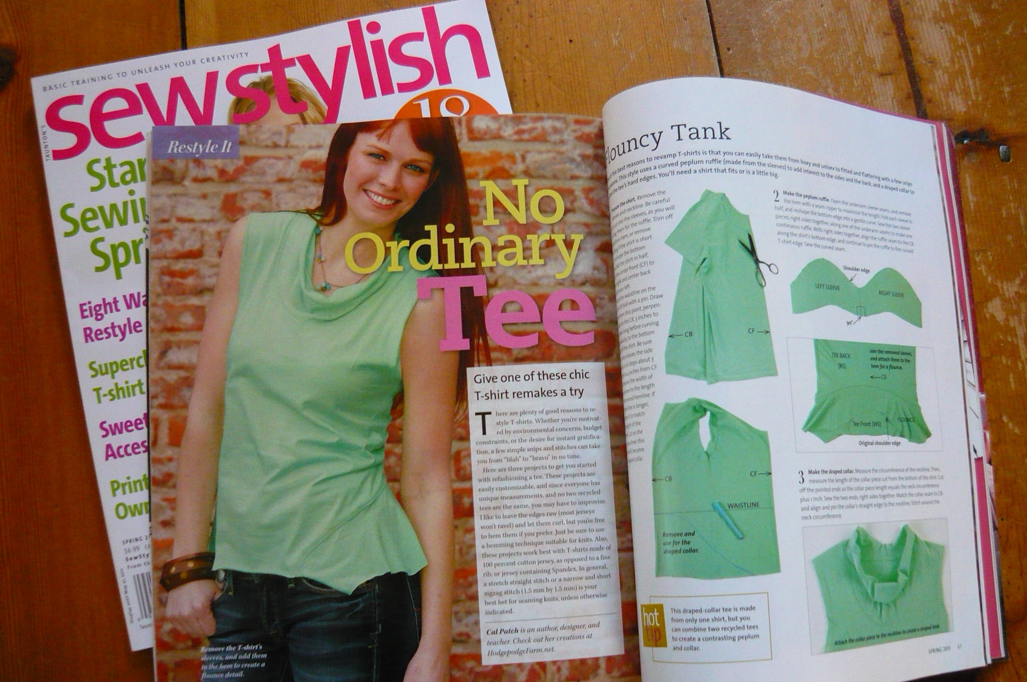 i have a T-shirt restyling article in the new issue of Sew Stylish… three springy projects that will help you transform those plain old boring T’s in your closet into cute *new* tops you’ll want to actually wear! those who’ve known me for a long time know that i’ve been a big re-vamper of T’s for so long i can’t even say when i began (i have a photo of myself at about age 12, wearing a dress i made from tees). one of the first classes i ever taught was one called ‘T-shirt Workshop’, way back when i had my shop in the Lower East Side. in that class, all we used was a pair of scissors to re-shape them into infinite combinations of neckline, sleeve, and hemline stylings. these new ones do require a little stitchery, but i know you’re up to it! if you make one, i’d love to see it…