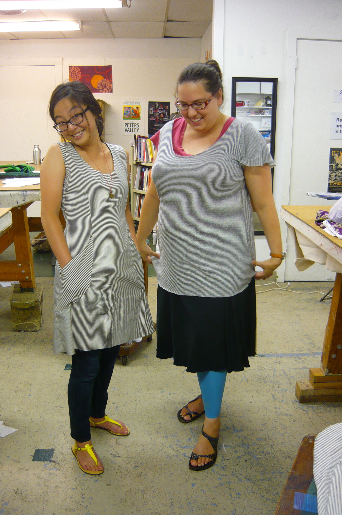 as promised, here are the clothes my students made in the 5-day class at Peter’s Valley Craft Center a few weeks ago. we had so much fun! i had six lovely ladies for the week, with a nice variety of body shapes! each of them drafted patterns for a skirt, T-shirt and dress, and then made at least one finished garment from each pattern. it was such a dream to have ample time in a workshop to do multiple projects and see the process through from drafting, to muslin/prototype, to fitting, to finished piece!