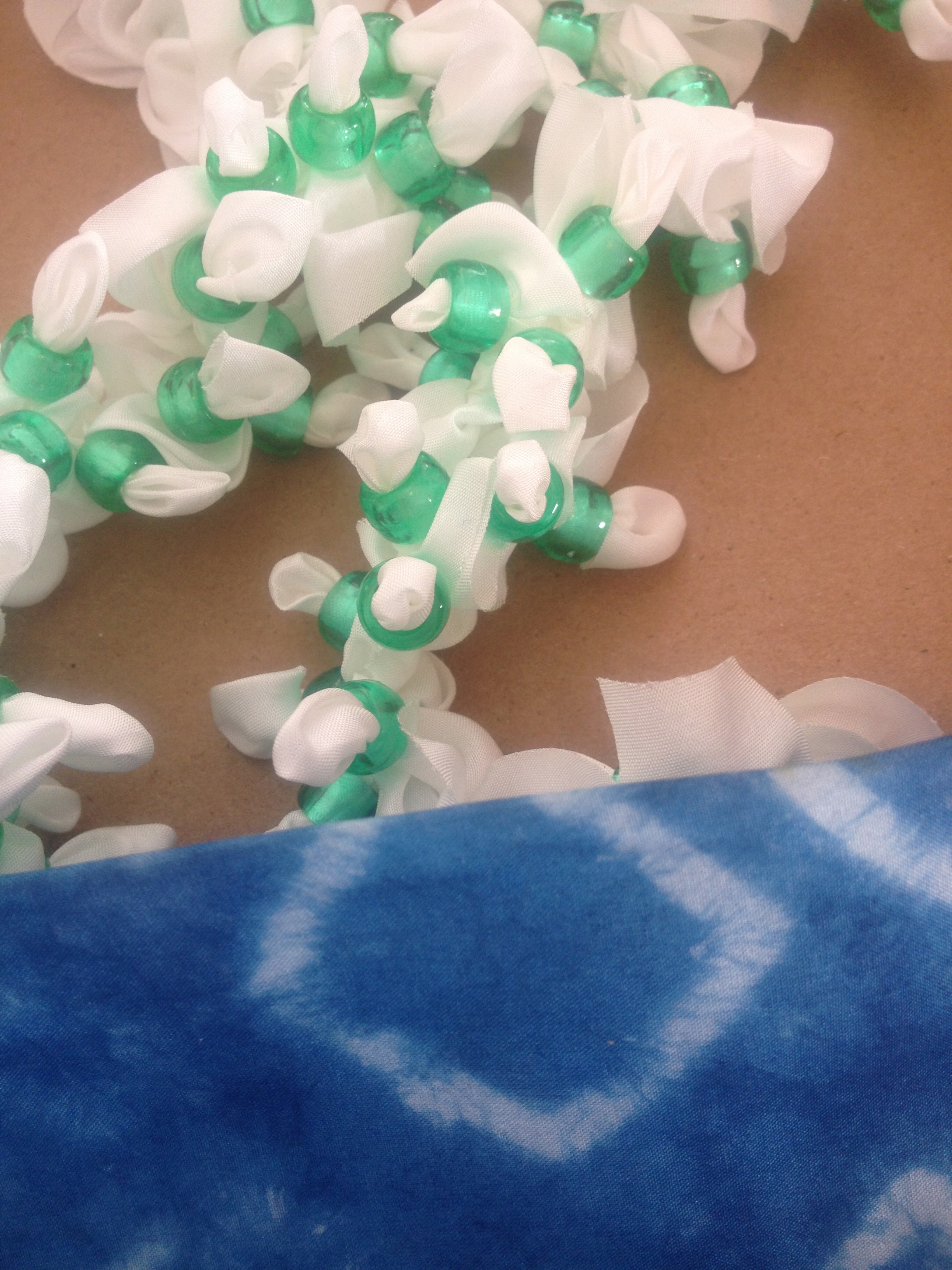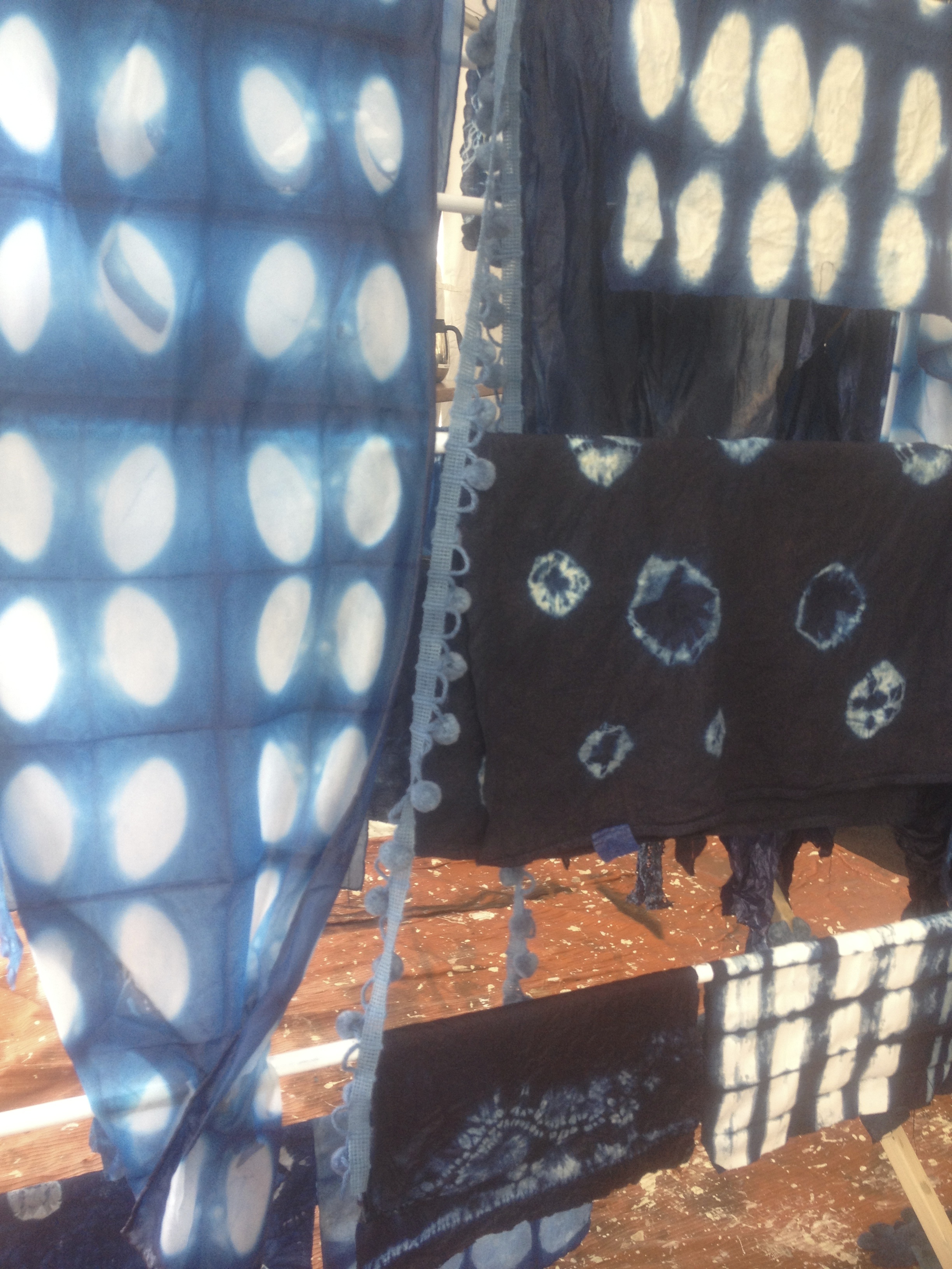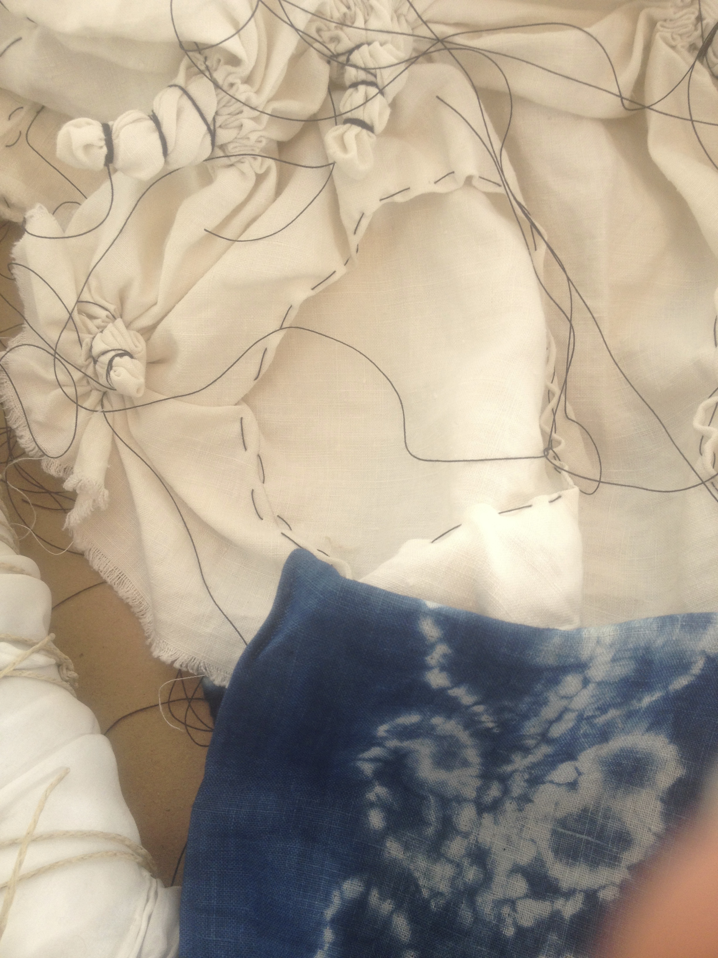 we did lots of different resist techniques, some super-easy and some quite labor-intensive, to create different shapes on the cloth when it’s immersed in the dye…