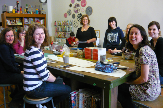 and here is my afternoon class, in which we made dress patterns (that’s Karyn second from right). i forgot to take a pic of the morning t-shirt class, which is disappointing because there was a surprise special guest in that one: Margie of Resurrection Fern, the most gorgeous blog you’ve ever seen in your life! i was speechless and floored (i think i even cried), and she gave me a very special gift too, which i promise to show you later. Margie came with Arounna of Bookhou, and it was a thrill and an honor to have both of these inspiring ladies in my class!